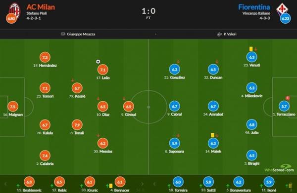 5月1日讯 在刚刚完毕的一场意甲第35轮比赛里,AC米兰主场1-0险胜佛罗伦萨,先赛一场暂以5分优势领跑意甲积分榜。在whoscored的赛后评分,此役踢满全场的托纳利获得7.9分为全场最高评分,打入全场仅有进球的莱奥获得7.1分。