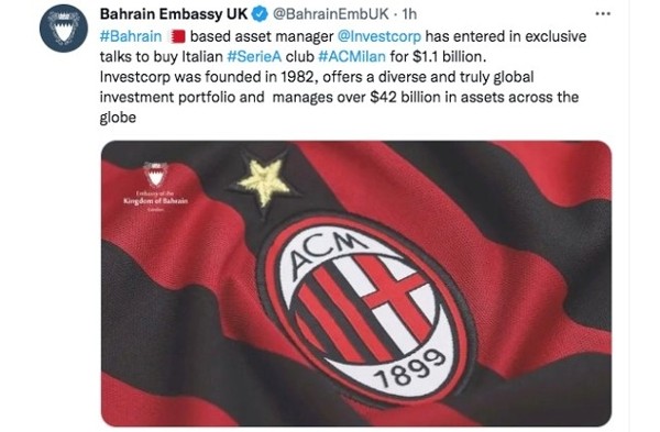 早前意大利传媒传出,investcorp基金以10亿欧元收购ac米兰,周一巴林注英国大使馆便在官方twitter证实,investcorp的确有意收购a米。