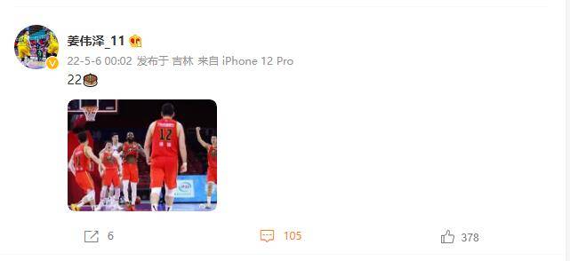 “22”姜伟泽在交际媒体上写道,并放了一个蛋糕的表情。此外,姜伟泽还放了一张战胜北京男篮的相片。