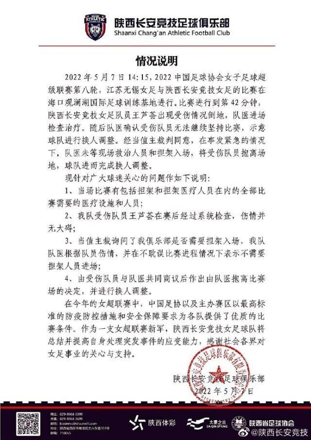 本赛季的女超联赛,一共只要10支球队在海口进行封闭式的竞赛,按理来说,赛会制的竞赛不应该出现如此低级的失误,更不可能连担架都不准备,或者是有担架却不使用。赛后,陕西队官方对本场竞赛的情况进行解说,称女超赛区是有装备担架、救护车等设备的,出现队医抱球员下场的一幕是因为其时情况紧急这位队医等不及担架救援。从竞赛画面中可以看到王芦荟在受伤后的意识清醒,并非情况紧急到来不及担架出场。