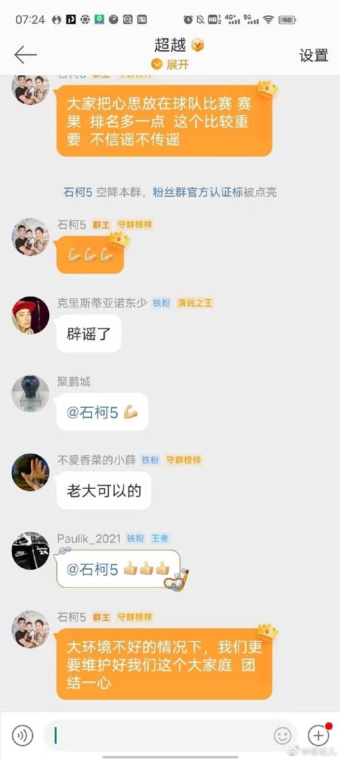 泰山球员石柯在交际媒体群里发声表明:咱们把心思放在球队竞赛、赛果、排名多一点,这个比较重要,不信谣不传谣。大环境欠好的情况下,咱们更要维护好咱们这个咱们庭,团结一心。