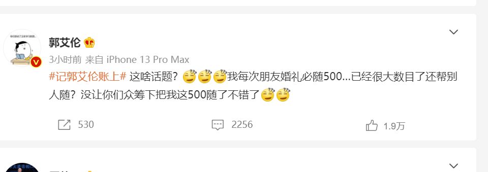 郭艾伦写道:“#记郭艾伦账上# 这啥论题?我每次朋友婚礼必随500…已经很大数目了还帮别人随?没让你们众筹下把我这500随了不错了”