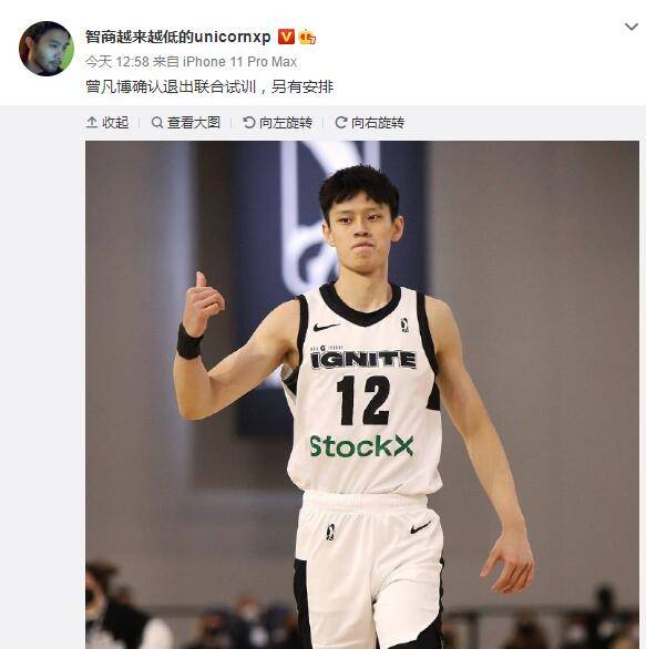 曾凡博之前入选了芝加哥联合试训的名单,按计划将在今日前往芝加哥参加联合试训。篮球媒体人在今日爆料:“曾凡博承认退出联合试训,另有组织。”