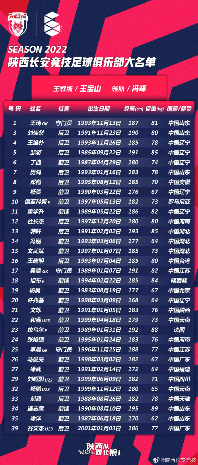 新赛季陕西长安竞技共32名球员,39岁老将杨昊领衔,3名外援在列。