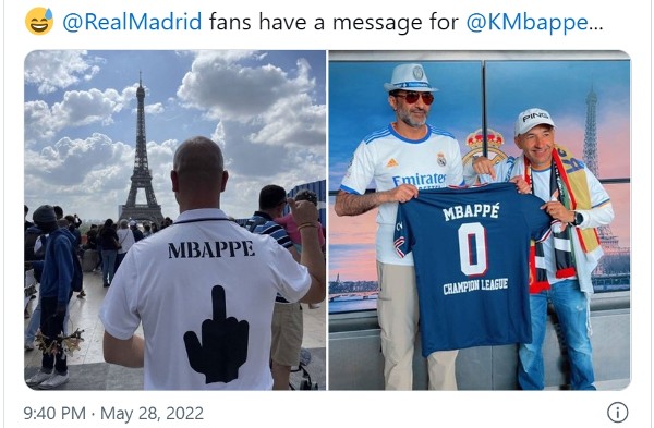 欧联决赛在法国的圣但尼球场上演,大批球迷聚集於巴黎。难得来到安巴比(kylian mbappe)的祖家,皇马迷自然不会放过「踩上门」的机会。