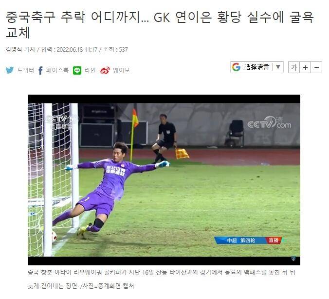 韩媒关注亚泰门将失误:中国足球要堕落到什么地步?