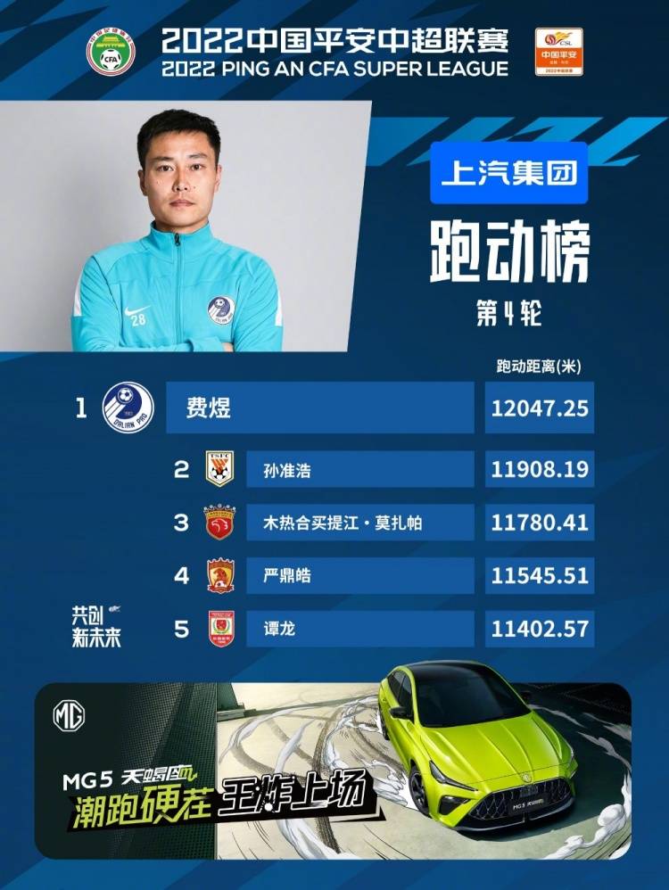 从数据统计来看,大连人球员费煜以12047.25米排名跑动榜榜首。泰山队外援孙准浩以11908.19米排名第二、海港中场球员买提江以11780.41米排名第四。此外,广州队球员严鼎皓、亚泰边锋谭龙分列四、五位。