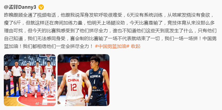 孟铎写道:“昨晚跟顾全通了视频电话,他跟我说浑身发软呼吸很难受,6天没有系统训练,从咳嗽发烧没有食欲,瘦了6斤,但就这样还在房间加练力量,怕明天上场腿没劲,今天比赛是输了,竞技体育从来没那么多理由可找,但今天的比赛我感受到了他们拼尽全力,谁也不知道他们这些天到底发生了什么,只有他们自己知道,我们无法感同身受,赛会制的比赛输了一场不代表就结束了一切,我们一场一场拼!中国男篮加油!我们都相信他们一定会拼尽全力!”