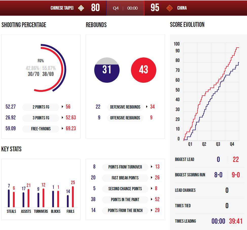 本场比赛拥有身高优势的中国男篮在篮板球控制上表现不错,赢了对手12个篮板球。进攻效率方面中国队也是优于中国台北队,两分球命中率56%,三分球命中率同样高达52.63%,几乎比对手高出一倍。