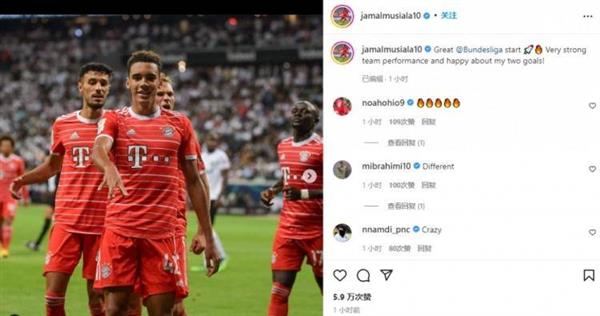 8月6日讯 拜仁在德甲首轮作客6-1大胜法兰克福,独中两元的小将穆西亚拉在赛后发文纪念胜利。