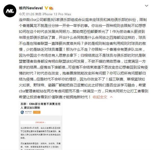 而睢冉则转发了文章并表示CBA的管理者自身都没明白联盟该如何发展,直言球员作为劳动者在俱乐部面前处于劣势。