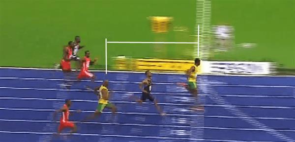 这场比赛当博尔特跑进终点时刻,我们可以通过下面截图,目测大约看出,阿萨法·鲍威尔与博尔特在实际距离中相差了约2-3米