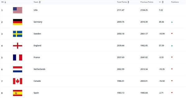 在世界女足排名中,美国女足依然高居榜首,在女足欧洲杯中获得冠军的英格兰女足,排名世界第四,获得亚军的德国女足则排名世界第二。
