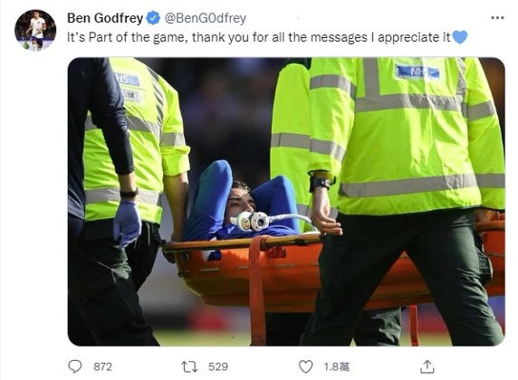 葛菲(ben godfrey)为自己受伤一事,於twitter上作出回应:「这都是足球比赛的一部分,感谢大家给我的讯息,谢谢大家。」