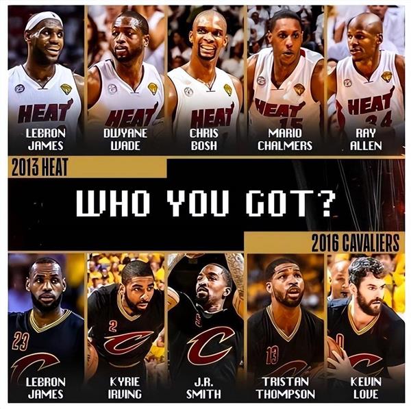 2016年的骑士队有勒布朗-詹姆斯、凯里-欧文和凯文-乐福这三巨头,还有J.R.史密斯、特里斯坦-汤普森、伊曼-香波特和理查德-杰弗森等一干猛将,而2013年的热火队有詹姆斯、德怀恩-韦德和克里斯-波什这三巨头,还有马里奥-查莫斯、雷-阿伦和迈克-米勒这些猛将。