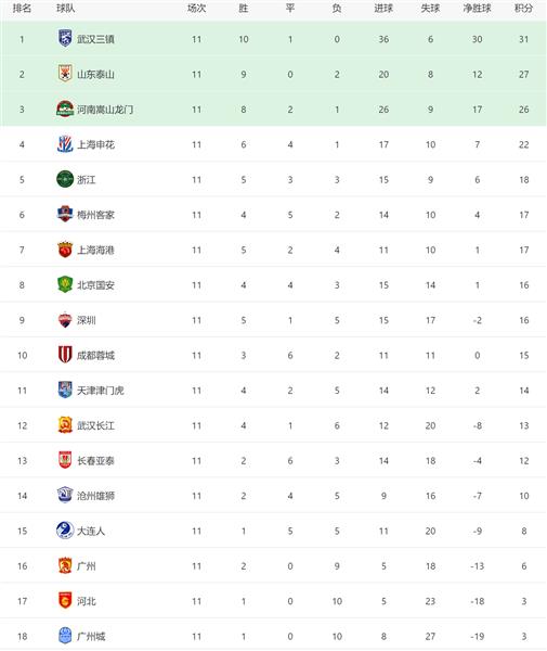 在积分榜方面,武汉三镇10胜1平,积分31分,暂列第一;山东泰山9胜2负,积分27分,暂列第二;河南嵩山龙门,凭借着今天的胜利,8胜2平1负,暂列第三。北京国安在0-3不敌河南队之后,4胜4平3负,积16分,暂列第8.