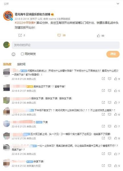 8月8日讯 在中甲联赛第14轮中,青岛海牛与淄博蹴鞠战平。这场比赛的结果让青岛球迷十分不满,并在赛后怒刷球队官博,呼吁海牛队主帅殷铁生“下课”。