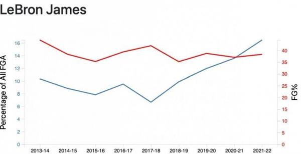 詹姆斯不光是这个时代最伟大的球员,同时作为一位经久不衰的得分手,是非常值得研究的案例。在NBA过去九年的投篮数据追踪期间,詹姆斯效力过三支需求和环境完全不同的队伍。令人印象深刻的是,詹姆斯即使换了球队,大部分的自主创造投篮选择并没有变。过去五个赛季,詹姆斯每个赛季都约有20%的投篮是自主创造的三分机会,中距离投篮约16%-20%,从詹姆斯回到骑士的第二年开始一直就是这样。不过,最近几个赛季,詹姆斯的投篮在两个方面有了明显改变。第一,过去两年里攻框的频率越来越低,于是禁区内自主创造的投篮机会越来越少。两年前率领湖人夺冠的赛季里,詹姆斯常规赛场均攻框14.1次,而本赛季就只有场均8.7次。与之相反的,詹姆斯受助攻三分出手越来越多,下图是詹姆斯2013-14赛季至2021-22赛季受助攻三分出手占比和命中率变化情况: