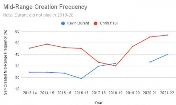 横坐标是赛季,纵坐标是自主创造的中距离投篮频率,红色对应保罗,蓝色对应杜兰特。