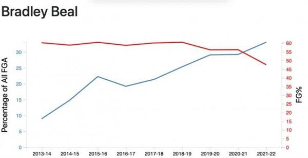 本赛季比尔攻击篮筐的频率是职业生涯最高的,也是距离篮框10英尺内自主创造的投篮第一次占比超过30%,很不幸的是,本赛季该类投篮的命中率只有47.6%,为职业生涯新低。