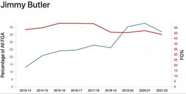 巴特勒从2019年开始冲击篮筐,内线创造的投篮占比相比于他拿下最快进步球员的赛季(2014-15赛季)几乎翻了一番。热火缺的就是攻坚手,巴特勒的身体素质、打法风格、持球能力和被低估的手感,都很适合热火。