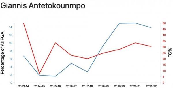 字母哥可能是这里最有趣的球员,2013年选秀大会雄鹿在第15顺位选中的字母哥,而这一年刚好是NBA开始详细追踪球员们投篮数据的第一年。如今字母哥已经成了世界上最出色的球员之一,同时拿下了一座总冠军奖杯和两座MVP奖杯。虽然字母哥的产量和责任越来越大,但是他在自主创造投篮机会方面只有一个地方发生了实质性变化:三分线外。下图是字母哥三分线外自主创造投篮机会的变化情况。