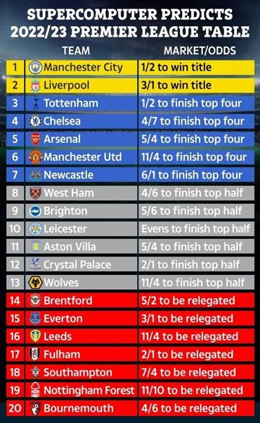 在积分榜另一端,三直升班马中的两支都不会听到好消息:伯恩茅斯的降级赔率只有6赔4,尽管“樱桃”在首轮旗开得胜,但超级计算机还是预计他们将在明年5月赛季结束时垫底。诺丁汉森林将以10赔11的赔率,和他们一起回到英冠;而南安普顿队以4赔7的赔率,被预测是第三个降级队。这意味着富勒姆(目前市场降级赔率1赔2)终于能结束连续五年在英超和英冠之间的“悠悠球”命运了。