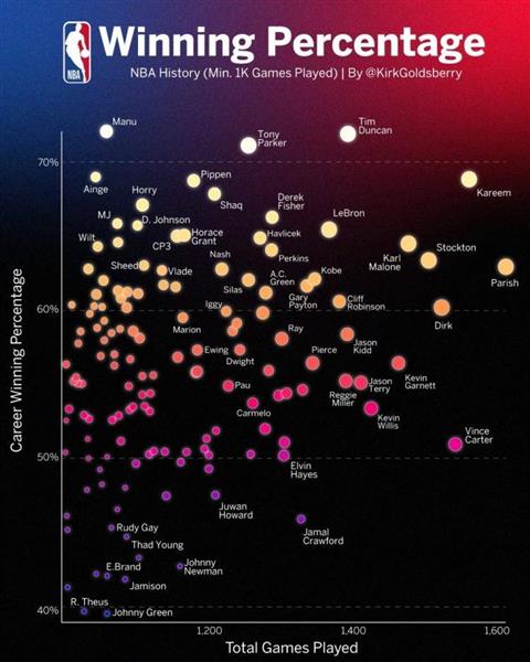 8月11日讯 今日,一名NBA数据分析师Kirk Goldsberry统计了有史以来参加比赛场次超过1000场的球员,共有141名。