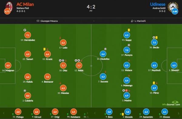 米兰替补:波贝加 6.0 吉鲁 6.0 奥里吉 6.0 德凯特拉雷 6.5 萨勒马科尔斯 6.0