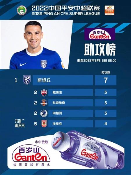 8月14日讯 中超官方发布了截止到8月13日22点的助攻榜榜单,其间武汉三镇外援斯坦丘以7次助攻强势领跑。