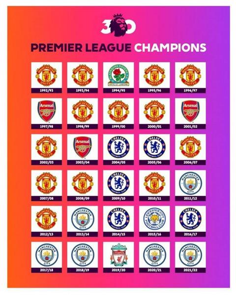8月15日讯 今年是英超联赛30周年,英超官推晒图展示过去30年的英超冠军,并配文:“下一个是谁?”