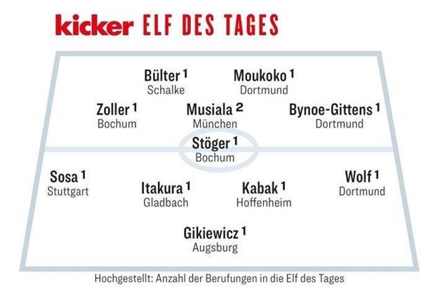 中场:佐勒(波鸿)、穆西亚拉(拜仁)、斯特格(波鸿)、吉滕斯(多特)
