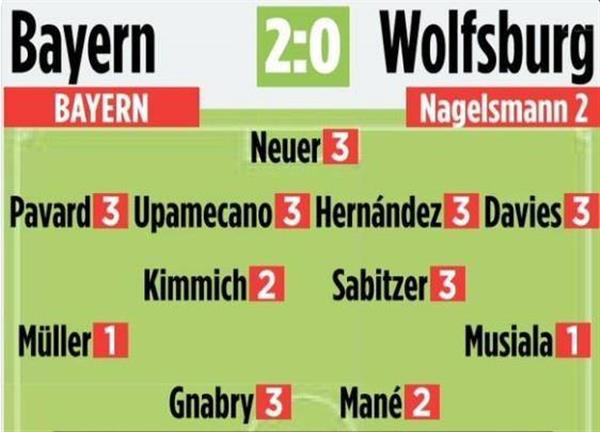 8月15日讯 拜仁在德甲次轮2-0力克狼堡,《图片报》在赛后对拜仁进行了评分,穆勒和穆西亚拉获得代表最佳的满分1分,马内和基米希也获得了代表优秀的2分。