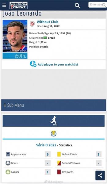 若昂-莱昂纳多现年28岁,长期在巴西国内踢球,这位前锋曾短暂效力过葡萄牙、格鲁吉亚、洪都拉斯联赛。