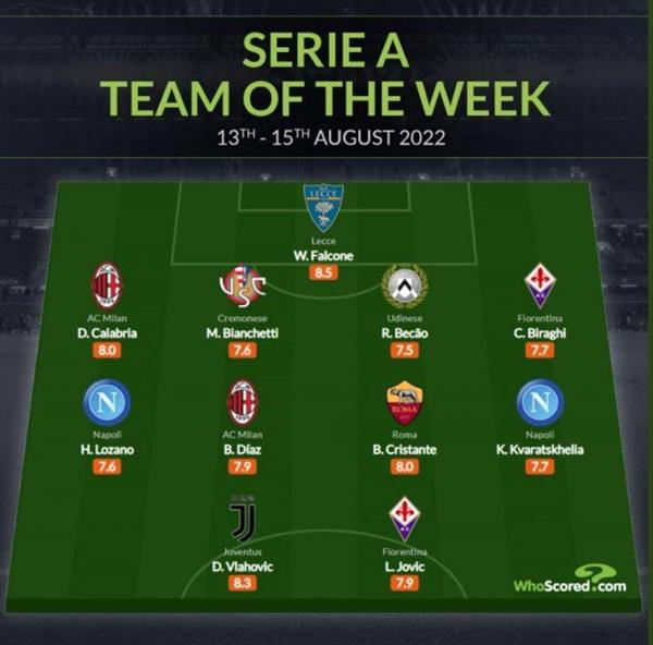 WhoScored意甲首轮最佳阵容