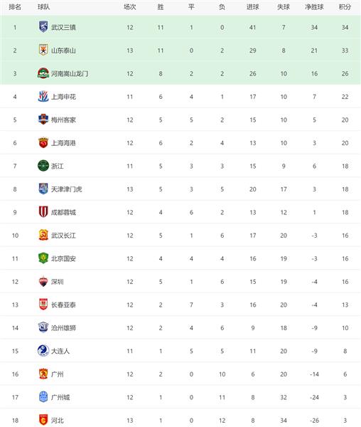 在积分榜方面,武汉三镇11胜1平,积34分,暂列第一;山东泰山,多赛一场,11胜2负,积33分,暂列第二;河南嵩山龙门8胜2平2负,积26分,暂列第3.上海海港6胜2平4负,积20分,暂列第六liu。