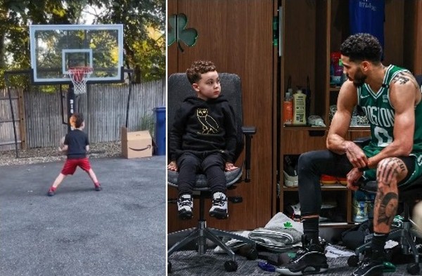 总决赛Game 6即将杀到,但塞尔特人当家球星帝谭仍趁着有空闲时间,在篮球场上教儿子打球。