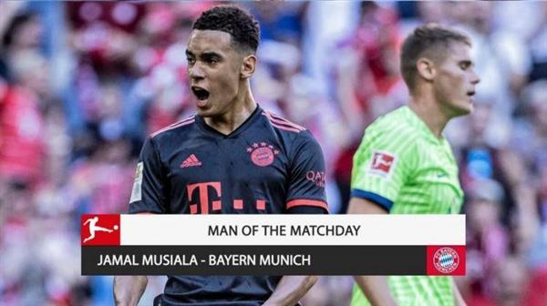 8月15日讯 德甲第2轮已经全部完赛,拜仁19岁中场穆西亚拉当选为本轮最佳球员。
