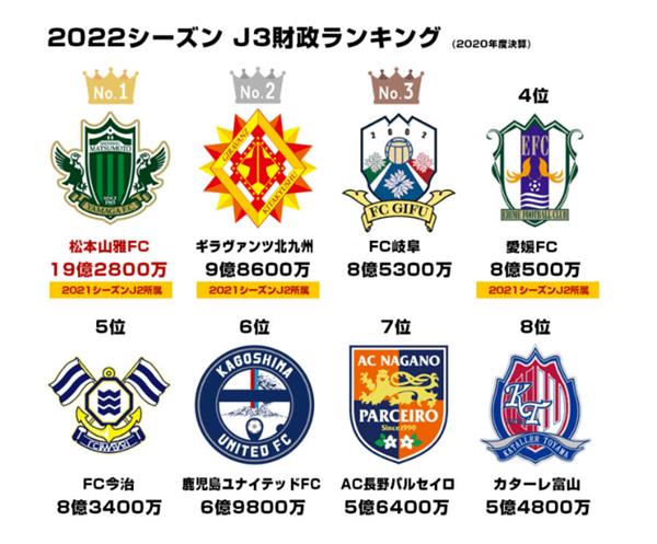 为了说明俱乐部目前的处境,富山胜利还将本赛季J3联赛竞争对手的财政状况贴在了官网上。2020年收入排名前八的俱乐部中,最高的松本山雅FC为19.28亿日元,最低就是富山胜利,只有5.48亿日元。但富山胜利本赛季排名J3联赛第六名,距离升级区只有5分之差,在联赛还剩8轮的情况下,仍然保持着升级希望。