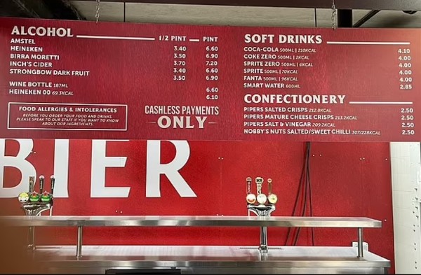 heinkekn每品脱由7镑减至6.9镑,moretti则由7.3镑下调至7.2镑,最便宜的苹果酒减0.2镑至6.6镑,但dark fruit cider维持在6.9镑,红酒依旧6.6镑,而且汽水等也没有减价。