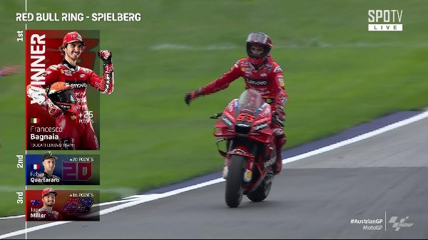 MotoGP奥地利站周日上演正赛,排第2位起步的意大利车手巴尼亚(Enea Bagnaia),一起步就超越巴斯迪安连尼,进占头位,最终以42分14.886秒率先过终点,连赢3站冠军。