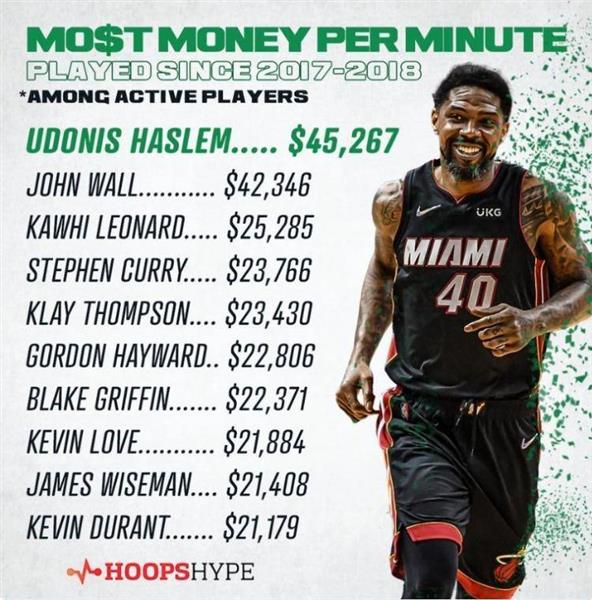 随后美媒HoopsHype晒出一项数据统计,过去5年时间里(指从2017-18赛季至今),哈斯勒姆在每分钟上场时间内(指总薪资除以上场分钟数)可以挣到45267美元,现役球员最多,沃尔每分钟上场时间内可以挣到42346美元,排名第二。