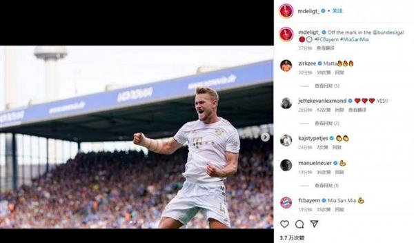 8月22日讯 拜仁在本轮德甲7-0完胜波鸿,首次在正式比赛首发的德里赫特在赛后晒照纪念。