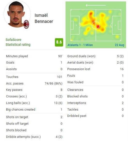 8月22日讯 米兰在本轮意甲1-1战平亚特兰大,打进扳平球的本纳赛尔本场数据如下: