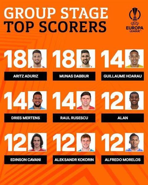 8月26日讯 欧联杯小组赛抽签结果已经揭晓,欧联杯官推也盘点了这项赛事小组赛历史射手榜,西班牙前锋阿杜里斯和以色列前锋达布尔以18球并列榜首,中国男足前锋阿兰以12球位居第6。