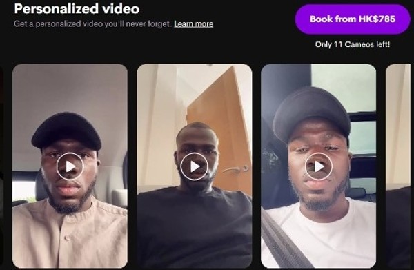这个特别服务来自一所美国的影片分享网站,他们与各个范畴的名人都有连系,只要在网站上找到你心仪的人物,就可以用特定价格买下自订内容的影片,有车路士球迷就花了80镑(约785港元)买到古尼巴利(kalidou koulibaly)向他贺寿的影片,这位球迷对此非常高兴:「难以置信!感激古尼巴利,你令一位老派车路士球迷的生日变得完美!」