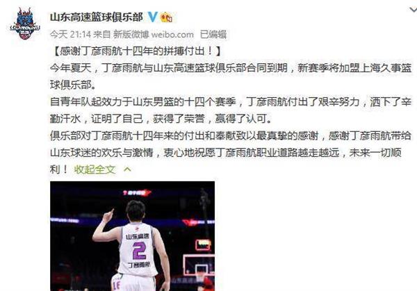 山东男篮:感谢丁彦雨航十四年的拼搏奉献未来一切顺利