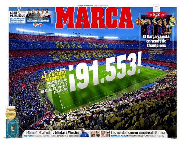 上赛季西班牙女足“国家德比”观众人数超过9万人,西班牙《马卡报》则在头版报道这一盛况。