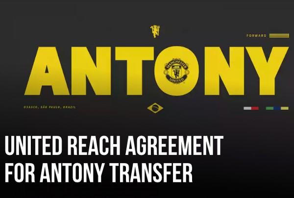 曼联发出声明:「我们已经与阿积士就安东尼(antony)的转会达成了协议,但需要先通过体测、确定球员最终条款,以及获得国际许可。」阿积士证实转会费为9500万欧元,根据附带条款有机会提升至1亿欧元,刷新了荷甲纪录。