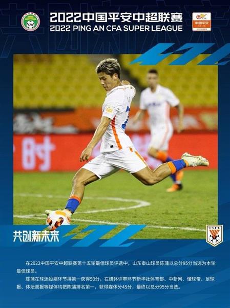 在2022我国安全中超联赛第十五轮最佳球员评选中,山东泰山足球沙龙球员陈蒲以总分95分当选为本轮最佳球员。